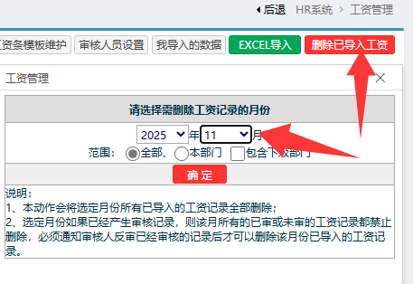可删除重复记录,前往工资导入,在右上角点击删除已导入工资,选择年月点击删除。 如果该月存在审核过的记录,就需要先反审,具体是前往工资审核,找到已审核的记录点反审,再回到上面的位置删除。 ![]() 该文章在 2025/11/3 8:46:58 编辑过 |