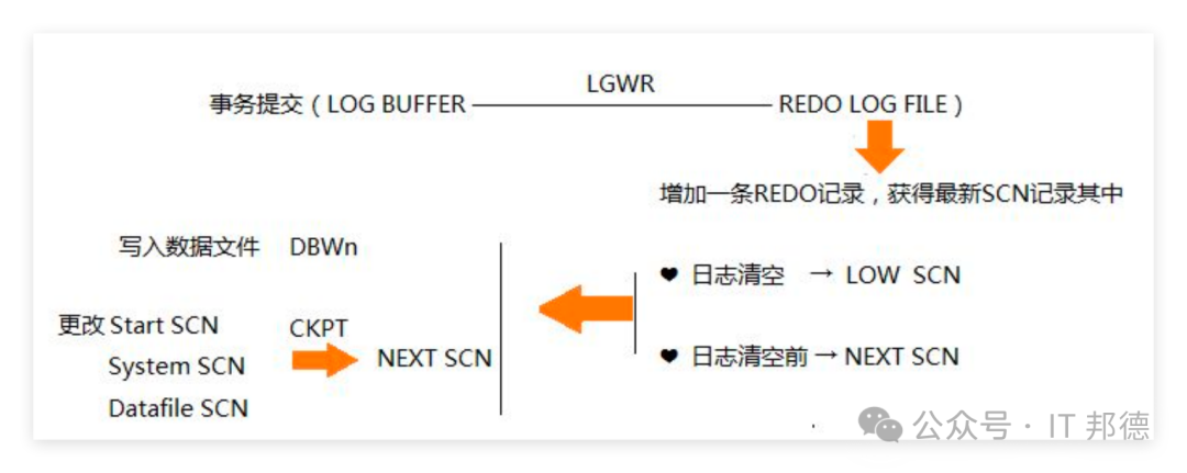 这 里 ,由 CKPT 进 程 将 NEXT SCN 的 值 同 步 更 新 到 START SCN 、 SYSTEM CHECKPOINT SCN 和 DATAFILE CHECKPOINT SCN 中,以确保所有文件的一致性。