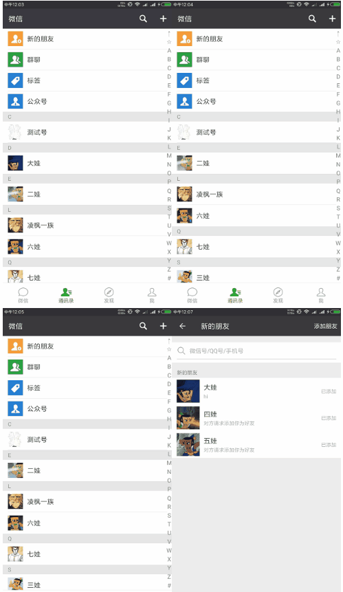 - 好友:查找好友、查找已添加好友、查找未添加好友、添加好友、修改好友昵称、删除好友、拉黑好友