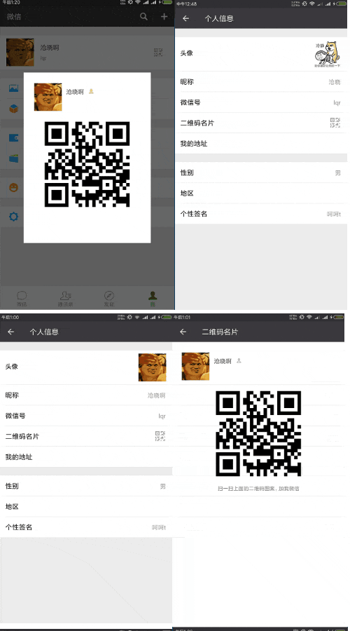 头像查看修改、昵称修改、二维码名片查看、性别修改、个人签名修改