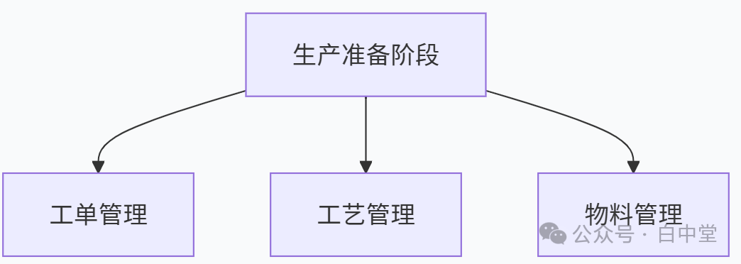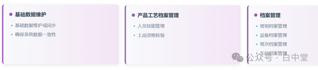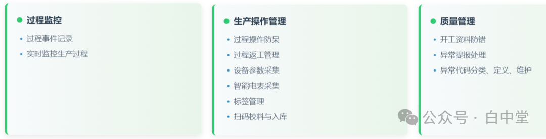 再进一步可按照颜色块和功能布局,把生产过程分为四大阶段,N个控制点。白中堂命名为:基础数据管理、生产准备、生产执行、产后分析。