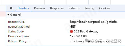 为什么状态码是502?因为博主用的是Nginx反向代理到后端服务器 - • 502 Bad Gateway:这是最常见的反向代理错误之一,当 Nginx 作为反向代理时,如果后端服务器(如应用服务器)无法处理请求(例如,由于宕机等原因),Nginx 将返回 502 错误。