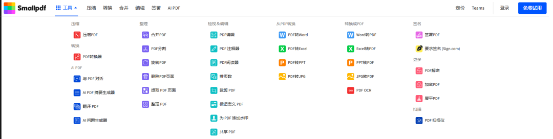 Smallpdf以30余种免费工具和直观界面著称,其“拖拽式”操作逻辑大幅降低学习成本。除基础转换功能外,其“PDF压缩”工具可在不影响质量的前提下,将文件体积缩小80%,适合上传附件受限的场景。尽管免费版存在功能限制,但其付费会员价格亲民,适合个人用户长期使用。