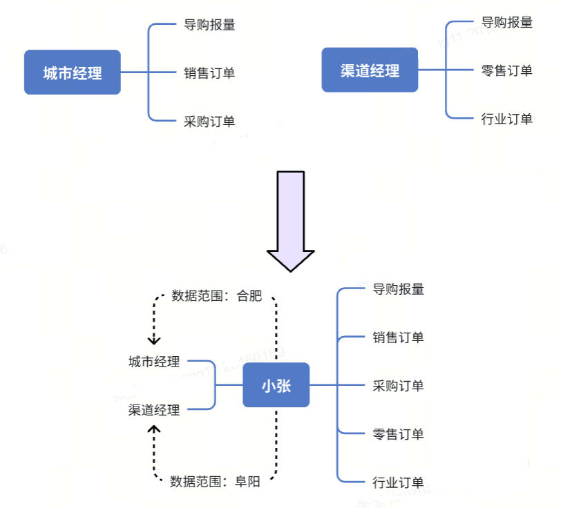 举个例子,系统设有城市经理(导购报量、销售订单、采购订单)三个功能权限和(导购报量、零售订单、行业订单)渠道经理两个角色。当用户小张同时担任这两个角色时,给城市经理时分配合肥的数据范围,给渠道经理时分配阜阳的数据范围。此时小张进入系统后会智能处理权限:功能权限取并集,可访问全部5个功能菜单;数据权限则根据当前访问的菜单自动切换 - 访问销售订单时仅显示合肥数据,访问行业订单时仅显示阜阳数据。对于两个角色共有的导购报量功能,系统则会取合肥和阜阳数据的并集。