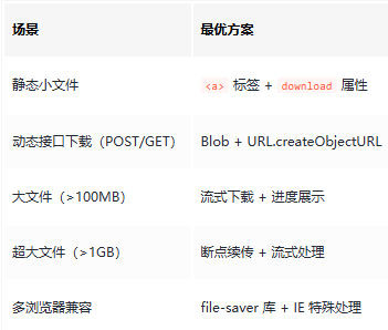 • 部分浏览器(如 Safari)对download属性的文件名特殊字符(如中文)支持不佳,建议后端返回Content-Disposition头兜底。