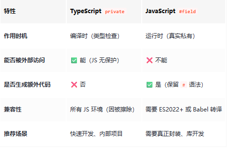 两者在能力上有显著差异:TypeScript 提供了更丰富的编译时修饰符,而 JavaScript(ES2022 起)引入了运行时私有字段。