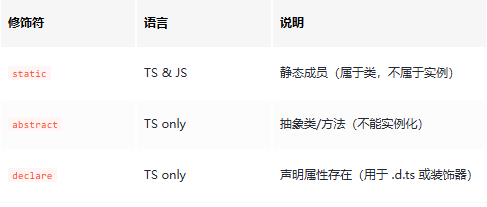 在 TypeScript 和 JavaScript 中,类成员变量(属性)的修饰符(Modifiers) 用于控制其可见性、可访问性和可变性。