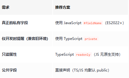 用 # 实现私有,用 readonly 实现只读,放弃 private(除非必须兼容旧 JS) 。