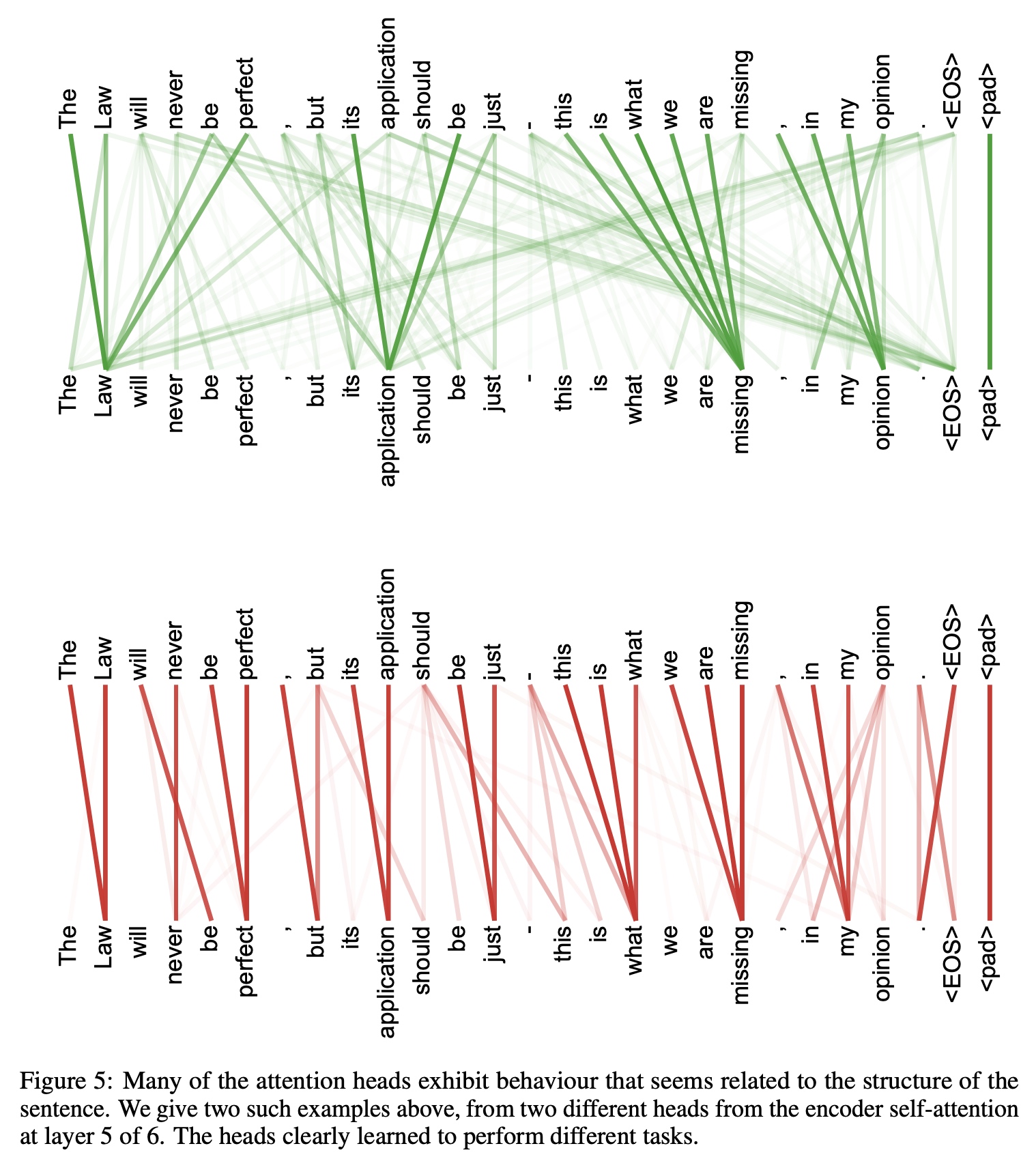 下图是论文最后给出的一个简单示例,描述了针对同一段文字,两个不同的注意力头所展现出的各自关系,可以看到确实存在明显区别: