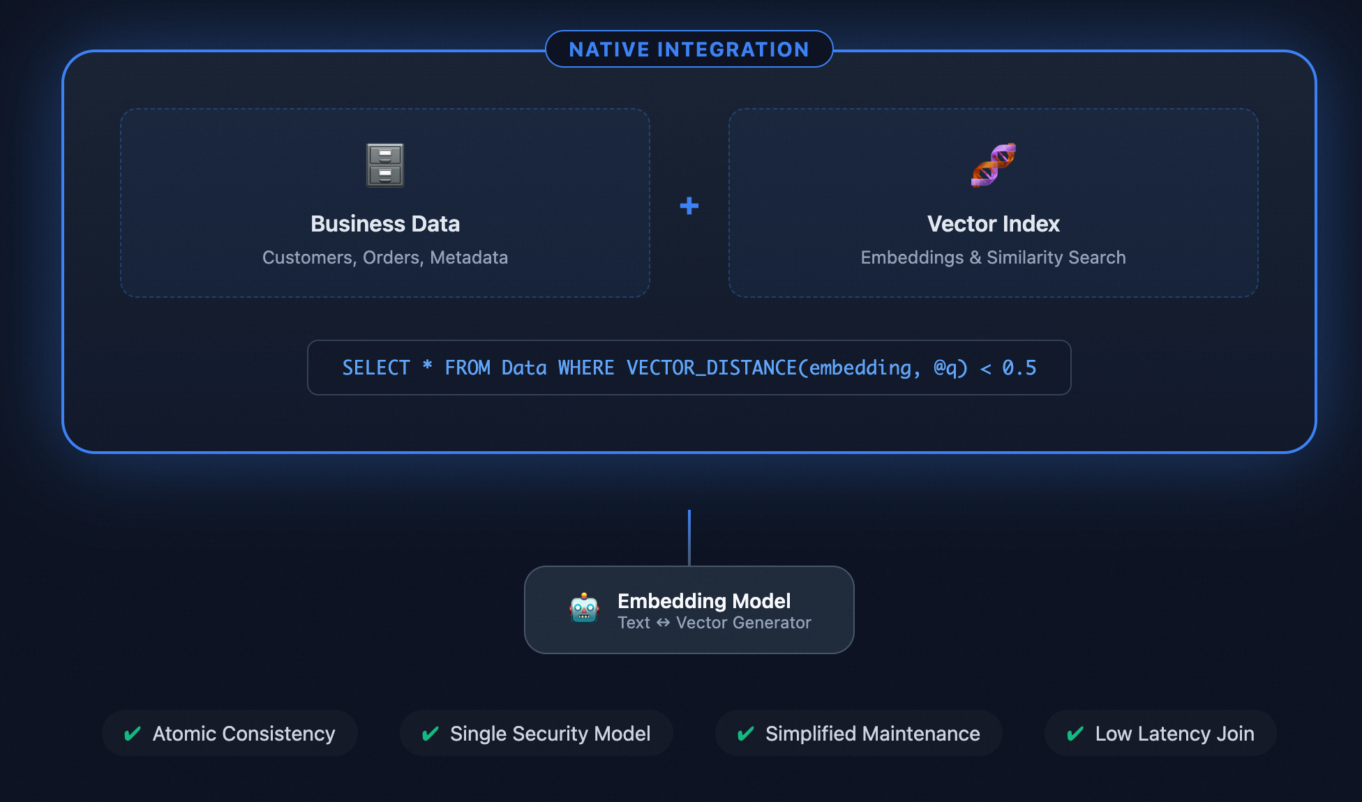 图:有向量支持之后的SQL Server 2025 而使用内置的向量类型+语义搜索,所有操作都可以集中在SQL Server中完成。
