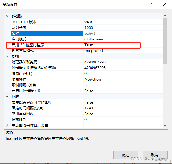 2、 选择网站的应用程序池》高级设置》启用32位应用程序改为true