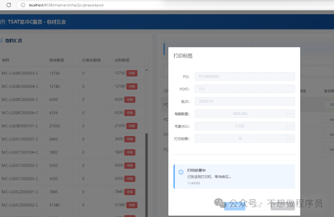 2、web端js,通过websocket访问ws://localhost与守护程序交互。注:如果web端使用了https,一定要用ws,用http会被浏览器阻止。 async printManual(){ if(this.isPrinting){ this.$message.info('请等待当前打印完成'); return } if(!this.printData.BoxQty) { this.$message.info("每箱数量必须大于0"); return; } if(!this.printData.GrossWeight) { this.$message.info("毛重必须大于0"); return; } this.isPrinting=true; this.setPrintResult('printing', '正在发送打印任务...'); try{ const res=await this.$post("@Url.Action("PrintManual", "Print")",this.printData); if(res.data.Status!=='OK'){ throw new Error(res.data.Msg||'获取打印数据失败'); } const taskId=Date.now().toString(); this.setPrintResult('printing', '正在连接打印机...', { taskId: taskId }); if(!this.printManager.isConnected){ await this.printManager.connect(); }