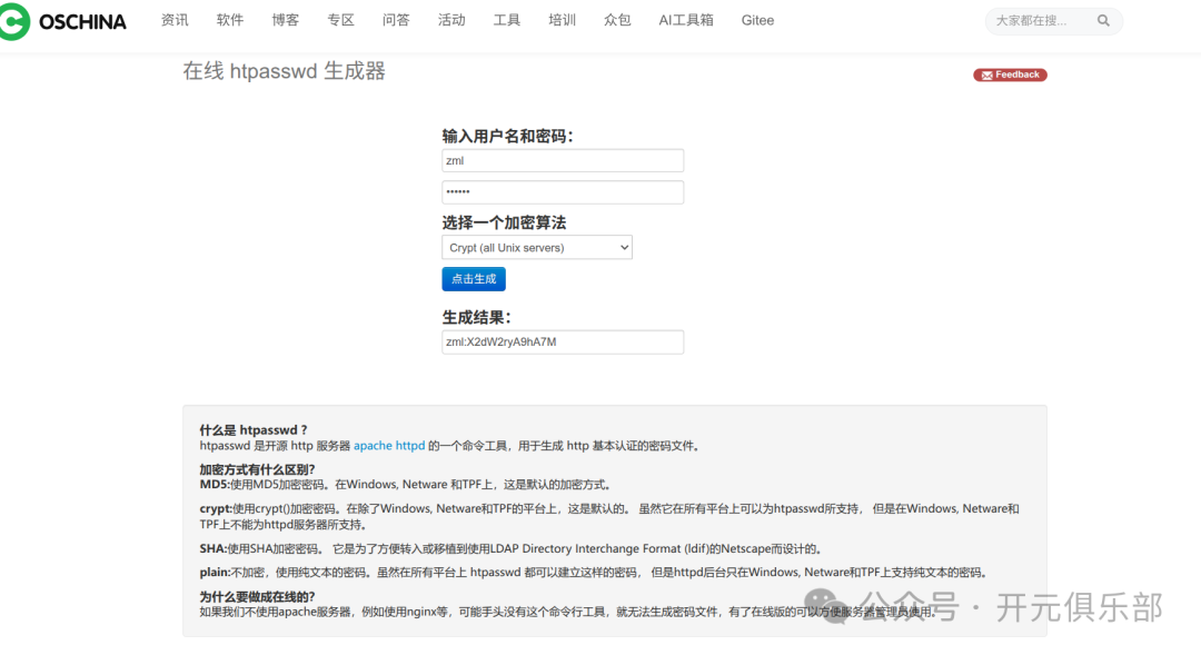 只需输入用户名和密码,它会自动生成加密后的字符串,你只需要将生成的内容复制并粘贴到服务器的密码文件中即可。