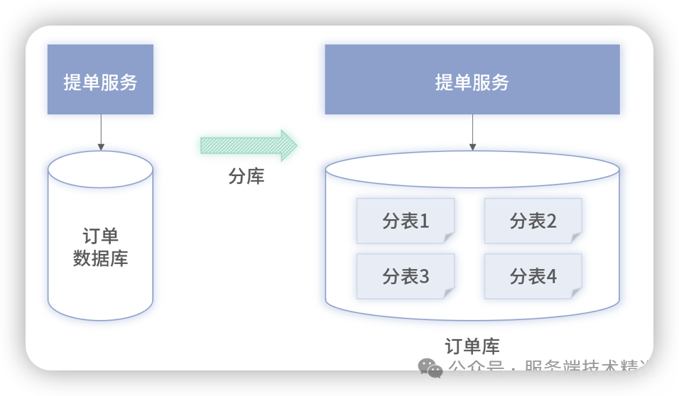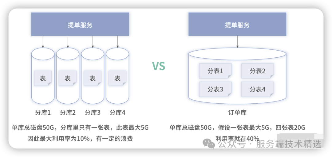 以本模块的订单案例来说,假设订单只是单量多而每一单的数据量较小,这就适合采用分表。单条数据量小但行数多,会导致写入(因为要构建索引)和查询非常慢,但整体对于容量的占用是可控的。采用分表后,大表变成小表,写入时构建索引的性能消耗会变小,其次小表的查询性能也更好。如果采用了分库,虽然解决了写入和查询的问题,但每张表所占有的磁盘空间很少,也会产生资源浪费。两种方案的对比如下图所示: