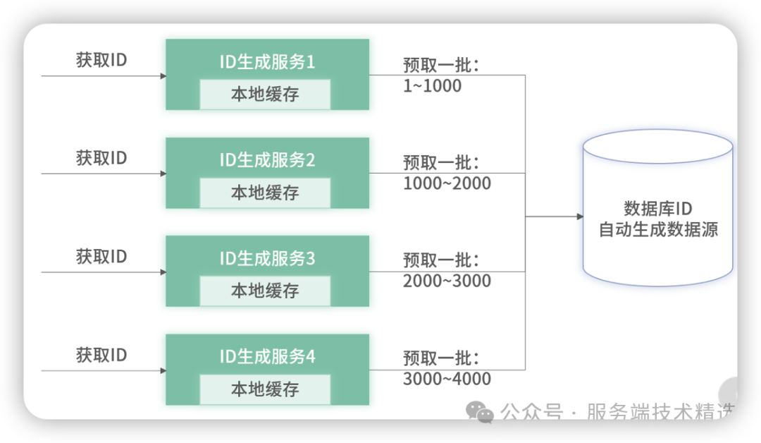 但如果每次获取 ID 时,ID 生成服务都需要从数据库实时获取,性能会比较差。为了解决性能问题,可以在生成 ID 的数据库前置一个具备持久化功能的内存缓存,预生成一批 ID。具体架构如下图所示: