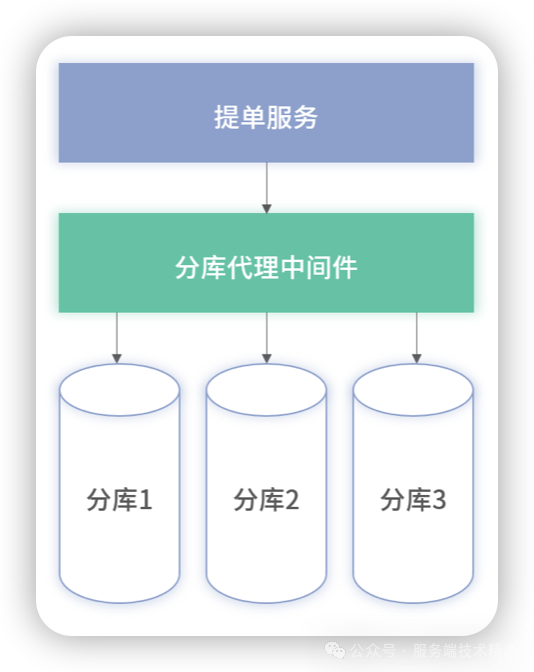 代理式分库中间件对于业务应用无任何侵入,业务应用和未分库时一样使用数据库,分库的选择及分库的维度对业务层完全隐藏,接入和使用成本极低。代理式的架构如下图所示: