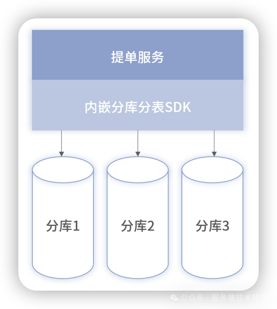 内嵌式分库中间件是将分库中间件内置在业务应用中,它只负责分库的选择,并不会解析用户的 SQL。在使用时,业务应用需将分库字段传递给内嵌中间件去计算具体对应的分库。它相比代理式性能更好。内嵌式的架构如下图所示: