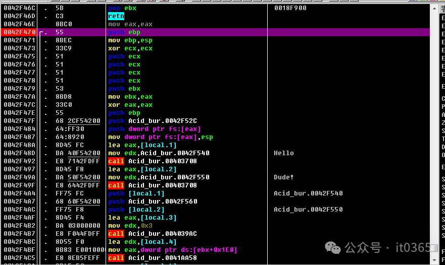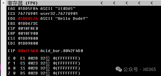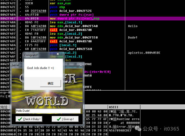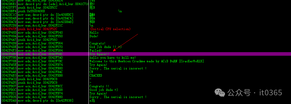 继续分析注册码注册功能,单击Serial按钮,随便输入个字符提示错误直接OD导入软件,F9运行起来和前面一样查找字符串,找一找有用的提示。字符串中有提示的字符,双击查看反汇编代码,找到代码头下断点继续F8走0042F4CA |. 8B45 F0 mov eax,[local.4]0042F4CD |. 8B55 F4 mov edx,[local.3]0042F4D0 |. E8 2745FDFF call Acid_bur.004039FC0042F4D5 |. 75 1A jnz short Acid_bur.0042F4F10042F4D7 |. 6A 00 push 0x00042F4D9 |. B9 64F54200 mov ecx,Acid_bur.0042F564 ; Congratz!0042F4DE |. BA 70F54200 mov edx,Acid_bur.0042F570 ; God Job dude !! =)0042F4E3 |. A1 480A4300 mov eax,dword ptr ds:[0x430A48]0042F4E8 |. 8B00 mov eax,dword ptr ds:[eax]0042F4EA |. E8 81ACFFFF call Acid_bur.0042A1700042F4EF |. EB 18 jmp short Acid_bur.0042F5090042F4F1 |> 6A 00 push 0x00042F4F3 |. B9 84F54200 mov ecx,Acid_bur.0042F584 ; Failed!0042F4F8 |. BA 8CF54200 mov edx,Acid_bur.0042F58C ; Try Again!!0042F4FD |. A1 480A4300 mov eax,dword ptr ds:[0x430A48]0042F502 |. 8B00 mov eax,dword ptr ds:[eax]0042F504 |. E8 67ACFFFF call Acid_bur.0042A170