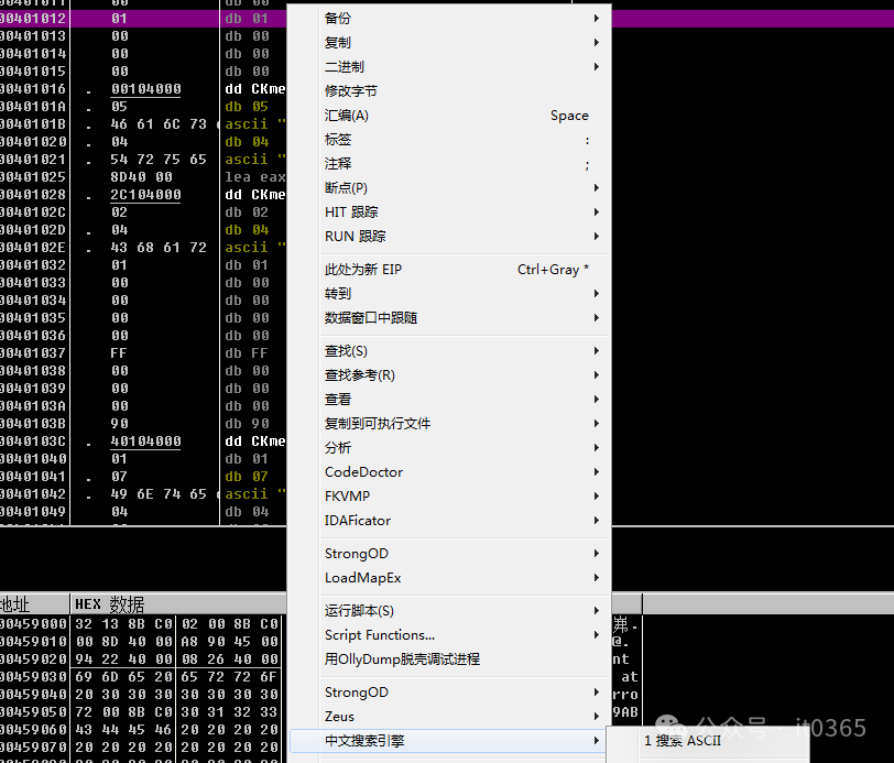反汇编窗口中查看,在反汇编窗口后,继续右键选搜索字符串