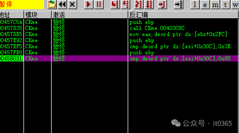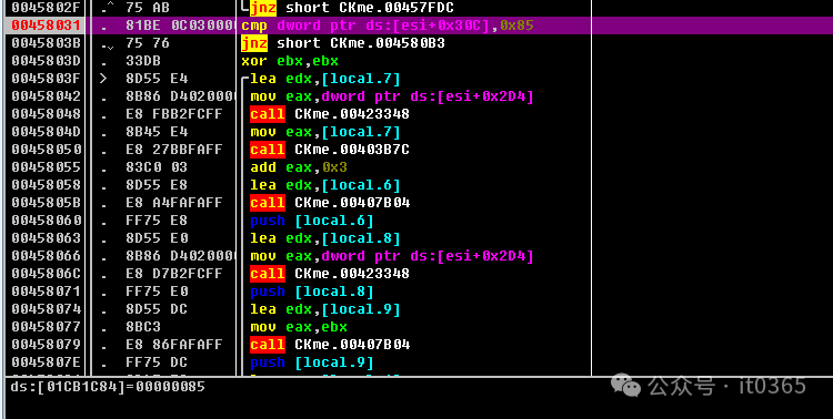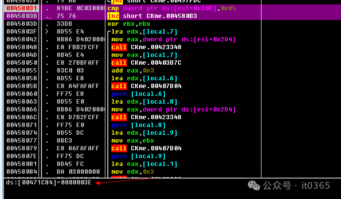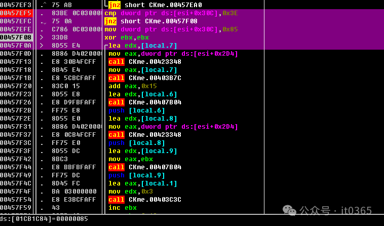 00457EF5  |.  83BE 0C030000>cmp dword ptr ds:[esi+0x30C],0x3E00457EFC  |.  75 0A         jnz short CKme.00457F0800457EFE  |.  C786 0C030000>mov dword ptr ds:[esi+0x30C],0x8500457F08  |>  33DB          xor ebx,ebx00457F0A  |>  8D55 E4       /lea edx,[local.7]00457F0D  |.  8B86 D4020000 |mov eax,dword ptr ds:[esi+0x2D4]