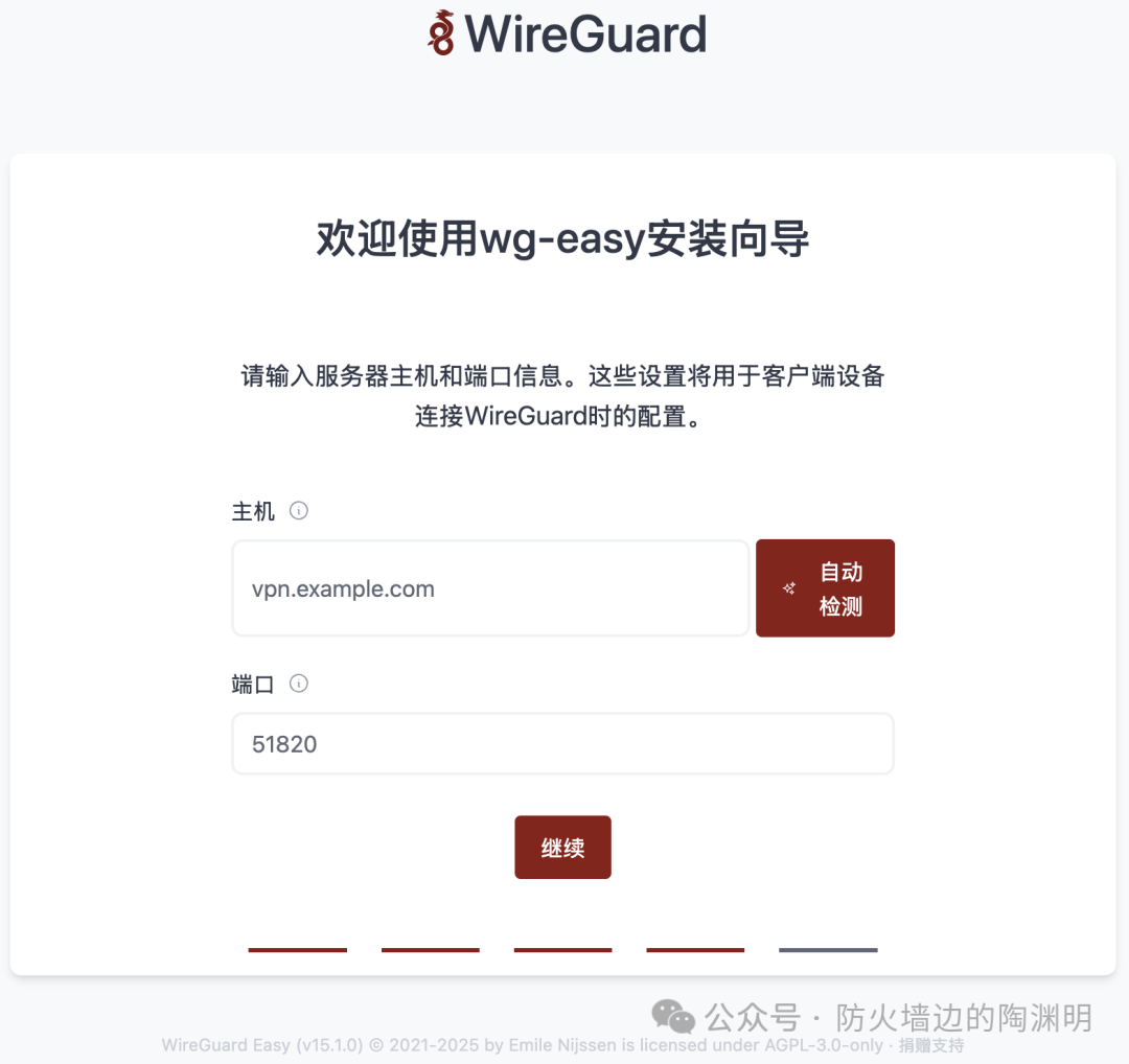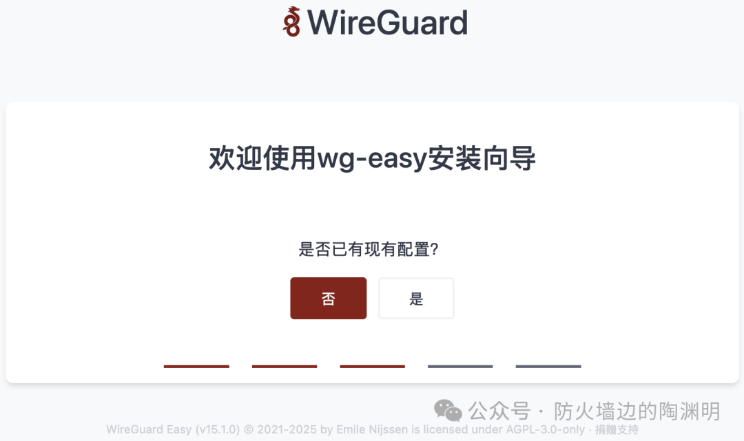 部署 WireGuard 有多简单?我们用 github 上的著名开源项目 wg-easy 来进行演示,它的部署方式以 Docker 为例,任何支持 Docker 的平台都只需几步即可完成安装与配置。项目地址: https://github.com/wg-easy/wg-easy 容器正常运行之后,就可以在 Web 页面进行初始化了。 访问地址:http://your.ip:51821
