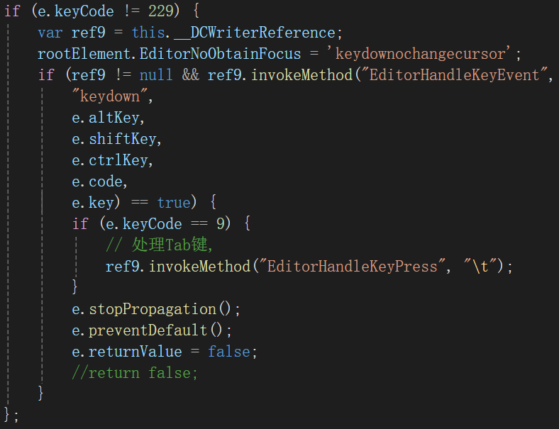 在这个键盘事件处理的JS代码中,我们使用invokeMethod()通过JSInterop调用了在C#端定义的EditorHandleKeyEvent()函数,并将事件参数传递给C#端。