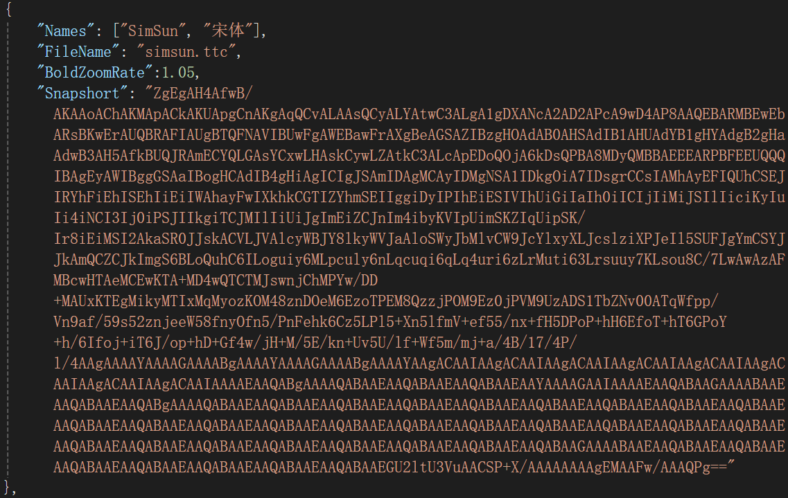 这样当所有的绘图操作完成,Graphics内部一结算,就可以获得一个包含绘图指令的字节数组,然后返回给JS端。 3.2.1.模拟Graphics.MeasureString()这里还有一个非常重要的成员方法MeasureString()需要进行模拟,这个方法用于测量字符的显示宽度,直接决定了文档的排版结果。由于文档中可能包括十万个字符,如果依赖浏览器的measureText(),则由于频繁的JSInterop操作降低性能,而且各个浏览器之间运算结果可能不一致。为此我们采用如下方法: 1.使用WinForm.NET开发一个专用工具解析字体TTC/TTF文件,提取所有字符的宽度数值。 2.将字符的Uncode编码根据相同的字符宽度来划分区域,以此将这些宽度数值高度压缩为“字体快照信息”。例如宋体字体文件simsun.ttc有18MB大小,由于是等宽字体,其快照信息仅 1KB。 3.由于快照信息很小,所以我们干脆将快照信息硬编码到程序中,为了方便维护,我们放置到JS中,其代码如下图所示。