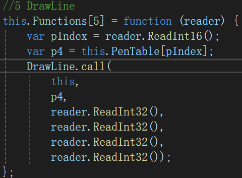 在这个循环体中,首先读取绘图指令编号,然后在绘图函数集中获得编号的绘图函数,然后进行调用。比如对于5号指令,这是绘制线段的功能,其功能代码如下: