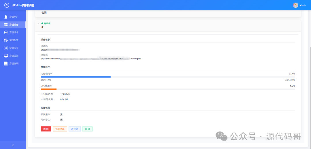 后台管理面板 配置、隧道、连接状态一目了然。