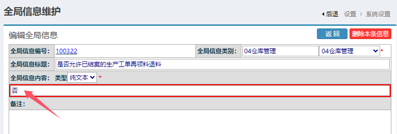 升级ERP系统到20251213A版,进入ERP系统-->全局设置。检索“结案”,找到“100322是否允许已经结案的生成工单再领料退料”。