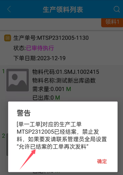 设置成功后,电脑端的领料,APP的扫码将禁止再次领料。