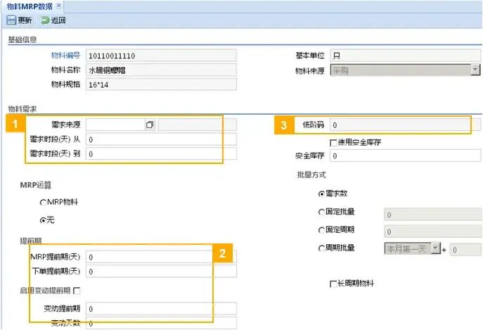 ① 默认生管员、默认工作中心、默认BOM、工序单位。 ② 用在工单下达,创建流程卡的时候使用。设置其中的数量策略和时间策略。 ③ 定义工序单位的基本单位,基本转换率是工序基本单位与库存基本单位的转换率。正常情况下,基本工序单位与库存基本单位一致,所以基本转换率为1。 ④ 在允差范围内的数量时,可以作为允许自动关闭的依据。比如数量为100时,允差设置为“10”时,执行数量在 90~110之间,都认为可以自动关闭控制引用的执行数量与原始数量的比例在上下差范围内。 ⑤ 作为BOM母件时的结构批量。建立BOM时使用,为制作BOM时带一个默认值。 (4)物料MRP数据