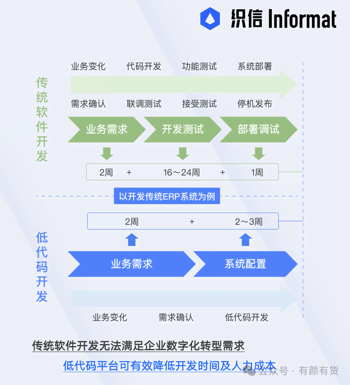 织信Informat作为一款“乐高型”的低代码系统搭建平台,其具有高度灵活的“数据+流程+角色”动态信息管理模型。平台深耕制造业,专注低代码行业解决方案,可以更专业快速的搭建企业运营所需的各类管理系统,大幅节约研发成本和时间,帮助企业实现全方位的数字化转型。织信Informat低代码快速开发工具,让系统开发更智能、更高效。大型企业的信息化需求逐年增长,其软件外包费用或人力成本开支与日俱增,财务预算却逐年下降。中小型企业受限于目前各类办公软件较高的费用而推行信息化速度迟缓。传统软件开发要经历业务需求、开发测试和部署发布三个大环节,复杂系统动辄需要一个团队半年以上时间,对于一些需求不能灵敏变更。传统软件的功能只能受限于厂商对于客户需求的理解,且无法满足企业不同时期或业务转型的变动。中大型企业业务流程和架构较为复杂,替换已部署应用的置换成本高,并存在信息安全等风险。这些问题通过织信Informat低代码均能很好解决。不可否认,制造企业进行数字化转型是必然趋势,但仍有不少企业对转型望而却步。据专业机构数据显示,89%的成长型企业处于数字化转型的探索阶段。一方面,中小企业缺乏数字化平台、转型能力不足;另一方面,MES等工业应用行业水平低、市场不集中,开发效率低、成本高等问题普遍存在,这都成为阻碍制造企业向智能化、数字化迈进的因素。多个MES系统低代码快速开发工具立足于自身在制造业的长期专注与沉淀,树立“好MES用低代码开发”,实现技术突破、知识沉淀和复用,让工业软件开发更简单,工业企业的应用和投资更简单,帮助企业形成适应自身发展阶段的数字化能力。(1) 基于低代码平台,以行业标准套件满足不同行业的业务需求,以微服务单元化重构业务,以低代码开发满足个性需求。(2) 提供全云化的开发平台和各种敏捷的开发工具,可以实现工业场景的各种复杂应用的开发,例如各类工控端的应用开发,数字孪生工厂、分析报表看板、过程预警监控等等。(3) 通过设备互联平台,可以快速简单互联各种协议的设备,快速实现IT与OT层数据对接。(4) 沉淀了海量丰富的标准化组件,通过低代码平台复制与应用,快速构建MES等工业应用(一站式管理),让企业数字化转型过程更简单、转型周期更短、转型成本更低。多个MES系统通过数十载的行业深耕沉淀,现基于低代码平台,可为汽车电子、新能源、智能装备、电子装配、生物医药、半导体等重点行业提供了MES等众多优质好用的工业软件。未来,这些MES系统将持续打磨平台,帮助更多的制造企业通过工业软件实现数字化升级。