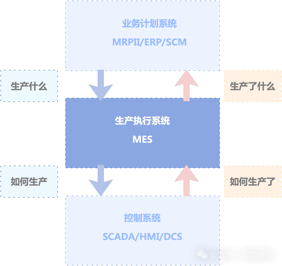 MES 制造执行系统 - Manufacturing Execution System 美国先进制造研究机构AMR(Advanced Manufacturing Research)将MES定义为“位于上层的计划管理系统与底层的工业控制之间的面向车间层的管理信息系统”,它为操作人员/管理人员提供计划的执行、跟踪以及所有资源(人、设备、物料、客户需求等)的当前状态。