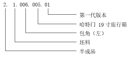 2. 半成品编码方式 例:物料代码“02.01.006.005.01”代表“哈特门 19寸旅行箱 左边包角 (第一代版本) 坯料”。