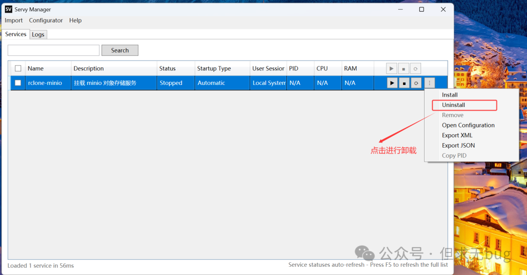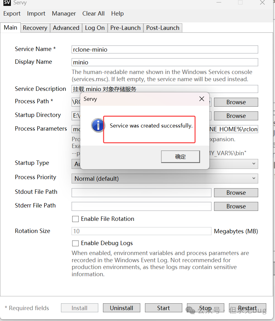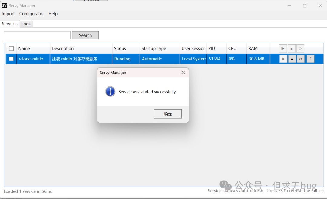 ![]() 下面还是以使用 RClone 挂载 minio 为例进行演示。 注册服务需用到 Servy 程序,其主界面如下所示: 各项参数的含义为: Service Name: Display Name: Service Description: Process Path: Startup Directory: Process Parameter: Startup Type: Process Priority: Stdout File Path: Stderr File Path: 在 Servy 中填写 RClone 挂载程序的结果如下所示: 可能有些会好奇,在 Process Parameters 中的 %RCLONE_HOME% 的作用,其实这只是引用我在 环境变量中设置的变量而已。该变量在 “Advanced”中进行了设置: 接着点击“Install” 进行安装,安装成功后会弹出如下提示信息 此时在打开的 Servy Manager 中按 F5 键刷新便能看到注册的 rclone-minio 服务: 此时打开 Windows 服务列表,发现已出现了 minio 服务: 在 Servy Manager 面板中点击对应服务的启动按钮即可进行启动: 点击后弹出如下启动成功的信息,且服务的状态也已由 “Stopped”变成了 “Running”: 此时在文件资源管理界面便能看到挂载的 minio : 关闭服务只需在 Servy Manager 管理页面点击如下关闭按钮即可 点击关闭按钮后,会弹出服务关闭信息,且该服务的状态也由“Running” 变成了 “Stopped”: 此时查看文件资源管理器,也发现挂载的磁盘已消失。 编辑服务只需在Servy Manager 管理页面中选择右侧的详情按钮,然后点击“Open Configuration”: 点击后便会弹出如下编辑窗口: 当然,刚确切说是填充了服务信息的创建窗口。编辑完毕后点击 “Install”再次安装即可。 卸载服务是在 Servy Manage 管理页面选择对应服务右侧的详情按钮后,点击“uninstall”便可进行卸载: 点击后会弹出卸载确认信息: 继续点击“是”便完成了卸载: 阅读原文:https://mp.weixin.qq.com/s/n2sgHYLBFnMmu4nXv9UCjg 该文章在 2026/1/20 10:58:27 编辑过 |