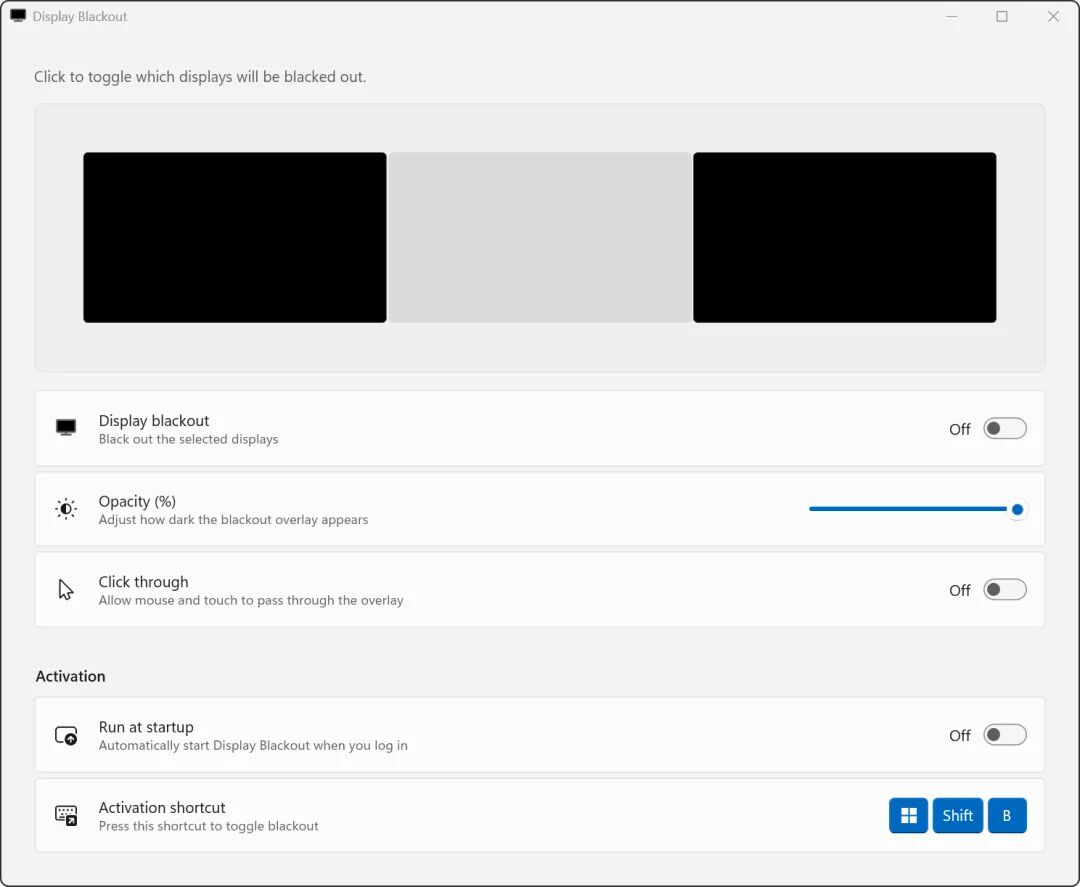 我用的是三屏显示器,在打游戏的时候,希望把左右两块屏幕“黑掉”。如果直接关掉显示器,Windows 往往会“抽风”好几秒,还会把当前所有窗口的位置打乱。但如果是 OLED 屏,只要盖一层纯黑窗口,就等于把像素全关掉,效果其实是一样的。