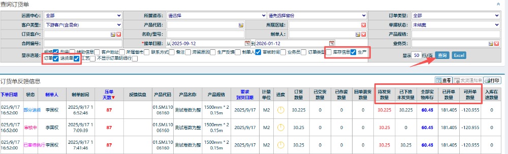 在此页面销售跟单人员可查看完整的货物(包括库存量,生产数量)以及订单信息。