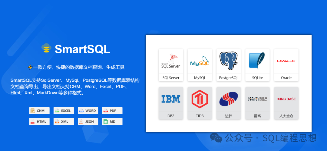 SmartSQL是一款方便快捷的数据库文档查询、生成工具,致力于成为帮助企业快速实现数字化转型的元数据管理工具。功能特性•多种数据库:SmartSQL目前已经支持SQLServer、MySQL、PostgreSQL、SQLite、Oracle、达梦数据库,正在开发Db2、TiDB、瀚高、金仓的支持。•丰富的文档格式:支...
