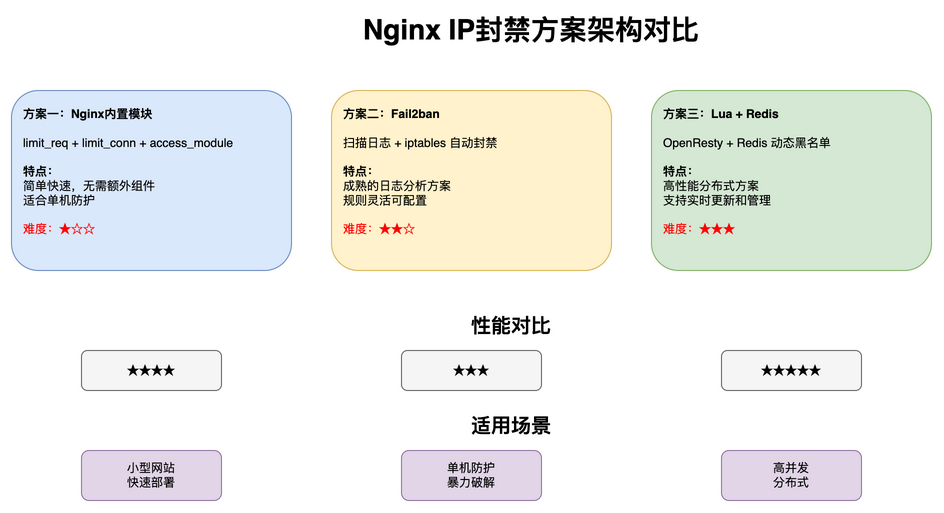 前言服务器遭受恶意IP访问、CC攻击、爬虫骚扰是每个运维和开发都会遇到的问题。当你的服务器日志里出现成千上万条恶意请求,手动一个个封禁IP显然不现实。本文将详细介绍三种主流的Nginx动态封禁IP方案,帮助你根据实际场景选择最适合的解决方案。一、为什么需要动态封禁IP?常见攻击场景•CC攻击:大量请求持续压垮服务器•暴...
