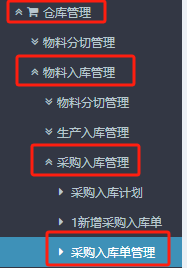 进入ERP系统,在左侧或者是上方菜单栏上找到”仓库管理“》”物料入库管理“》”采购入库管理“》”采购入库计划“