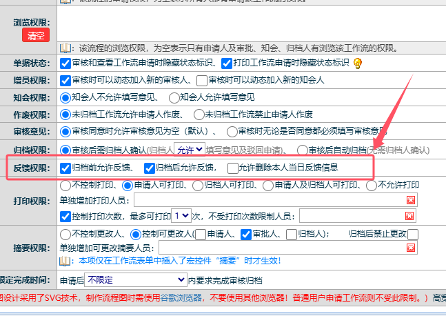 工作流申请归档后如何设置允许继续反馈内容?