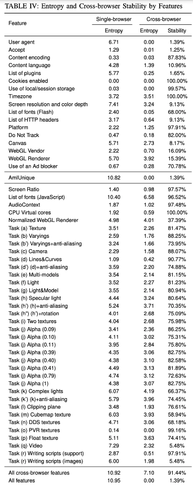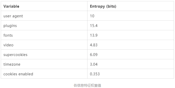 在论文《Cross-Browser Fingerprinting via OS and Hardware Level Features [http://yinzhicao.org/Tracking...]》中更是详细研究了各个指标的信息熵和稳定性。