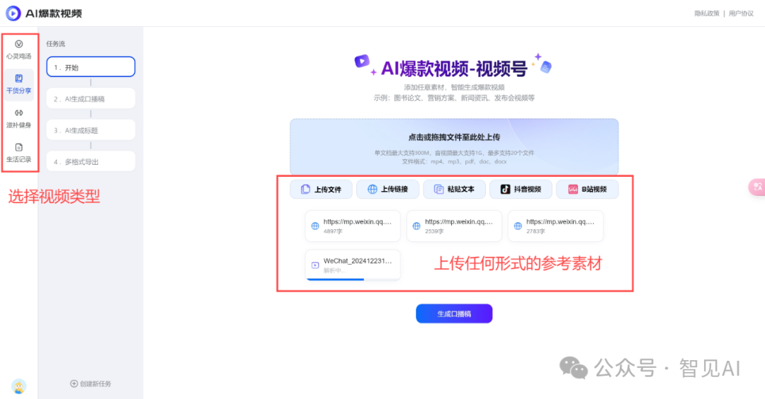 。纳米搜索的写与读功能,实际上是服务于AI搜索结果的输出与分享场景,创新地引入播客功能,使得知识分享变成一个更有趣的社交场景。入口在网页端首页的下方,很显眼的大字【AI爆款视频】,下面我就以【做一个介绍纳米搜索的口播视频】为目的,给大家详细演示一下怎么操作。进入功能主页面后会展示可以创作的爆款视频类型,包括抖音、小红书、视频号、B站等,应有尽有!同时介绍了平台对于这几个视频平台内容特色的理解,选择不同的类型会有相应的优化,这里演示以视频号为例。进入视频号创作流程后,左侧一列可以选择视频的类型,目前包含了4种高频的类型,我这就属于干货分享的类型。页面的中央则是素材上传区域,基本上你能想到的素材类型都可以上传,本地的文件、网页链接、粘贴的文本,流媒体目前支持了抖音和B站。上传完所有参考的素材后直接点击下方的生成口播稿,就可以先按照官方的默认的配置生成一篇干货分享语气的初稿。在中间的口播稿工具一栏,可以重新选择口播的风格以及钩子的类型,我这里选择了经验和高价值类,符合我分享内容的主题。点击重新生成后,就会在右侧得到一篇符合要求的口播稿。这时可以手动修改也可以继续让AI帮你编辑。到这一步,你其实是可以利用里面的文本编辑功能把文章修改完,直接复制出去写一篇公众号的。这里我们选择继续生成口播视频,点击下一步。这时,会首先进入到标题的确认流程,系统会根据你选择的语气以及钩子类型帮你自动生成十条标题。你可以根据左侧的热门标题进行重新生成,也可以对已有的标题进行手动编辑或者AI润色。接下来,会进入多格式导出流程,这里可以选择导出多格式的文稿;还可以导出音频格式,可以选择系统内置的音色,这里和上面的播客功能比较类似。选择一个预设的形象后直接选择导出,这时系统会给到一个导出倒计时,一般会提示12分钟,实际导出时长要短一些。除了使用预设的数字人形象,还可以根据自己的形象去定制数字人,这里只需要上传自己一段10s-5min的朗读视频即可,理论上时长越长效果越好,但对应的处理时长就会更长。这里我自己对着系统给的文稿录了一段20s的视频,上传创建后,整体的数字人训练时长大概在15分钟左右。训练完成后,选中自己的数字人,点击导出视频,导出时长大约5分钟左右。给大家直接看实际效果,鄙人献丑了