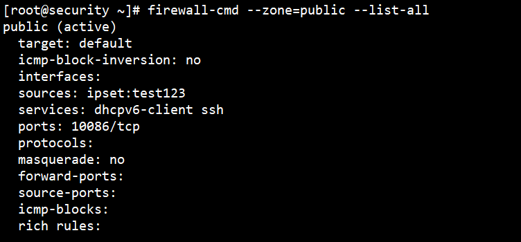 创建一条引用的策略 重新载入防火墙配置启用这条策略 然后使用firewalld --get-ipsets就可以看到  看下这个地址组里面有那些地址  看看public这个区域的策略情况  大家可能也注意到了,我们上述添加策略时只用了一部分参数,例如区域、源地址或者目的端口,那么为啥源地址和源端口不一起用呢,那是因为firewalld默认上同时只支持一个参数的变化,两个参数会造成互斥,不像iptables可以加一条参数,有许多参数,当然firewalld也有办法添加多个参数的策略,那就是“富规则”。 该文章在 2025/9/16 12:04:59 编辑过 | 关键字查询 相关文章 正在查询... |