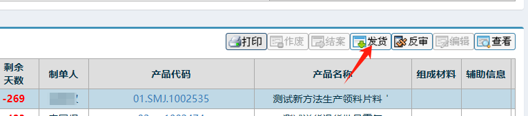 :点晴ERP-调拨出库单-发货操作  点击进入 如下图;   点击一条信息后,背景变色后,点击发货按钮 如下图: