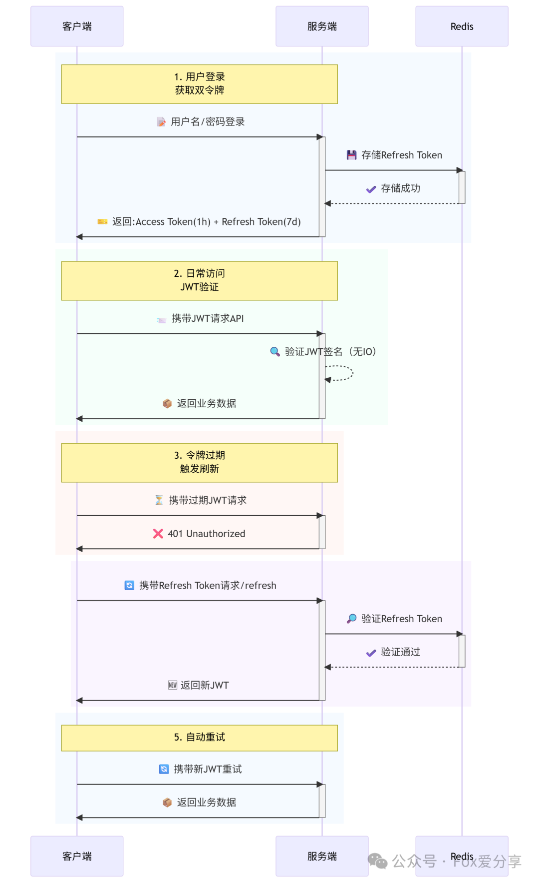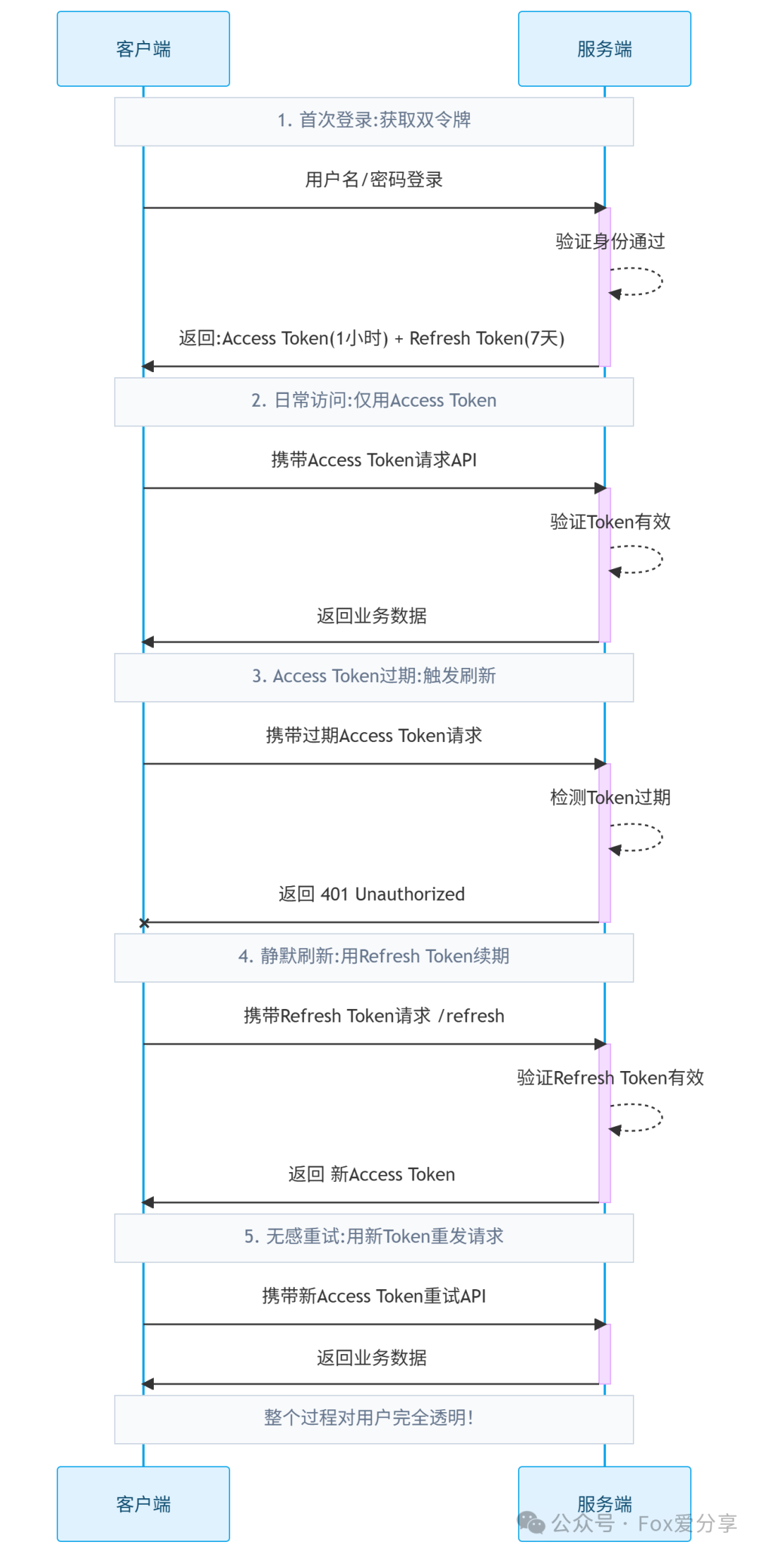 - 无感重试客户端拿到新的Access Token后,重新执行刚才失败的API请求。整个过程对用户完全透明。