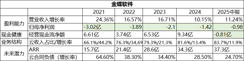 1、传统业务断崖式下滑,云业务增长失速。 24年与25年的营收双降是最危险的信号,传统软件license收入的下滑速度,远超云订阅收入(24年云收入同比-3.4%)的填补能力,云业务增速从55.5%骤降至个位数甚至负增长,说明用友的新客获取和老客拓展面临巨大阻力、行业化价值待评估、BIP战略投入巨大但变现缓慢。营收负增长是比亏损更危险的信号,说明其产品定价权、客户留存率、市场占有率正在松动。 2、主营业务造血能力衰竭,利润质量有待提升。 归母净利润从盈利滑向亏损,且经营现金流持续恶化,不仅是因为未来研发、营销层面的投资,也因主营业务造血能力衰竭。现金流净额与净利润的严重背离,表明利润质量差,大量亏损被应收账款等资产挂账,公司运营对外部融资的依赖加剧。 3、潜力与现实的残酷割裂。 ARR和云合同负债的增长是唯一的亮点,证明了用友产品战略和平台价值理论上的存在潜力,积累了未来的收入池。然而,ARR无法有效、及时地转化为当期营收,说明签单能力未能高效转化为交付能力和客户成功能力。可能因为大项目定制化交付周期长、成本超支、客户实际使用效果未达预期导致增购困难等。 4、BIP生态战略的双重困境。 对内,高举高打的平台研发投入巨大,但边际效益递减,拖累当期利润;对外,在高端市场,面临SAP等巨头的正面压制,在中端市场,又被友商的标准化产品和敏捷打法快速蚕食。其战略定位陷入两面作战的被动局面。 写在后面: 近五年的财报数据,表明用友仍是一家为生存而战的转型巨头。它手握未来的期权(ARR),但正消耗当下的本金(现金流与资本)。其成败关键在于:能否在未来12-18个月内,将ARR潜力大规模、高效率地转化为营收增长,并显著改善现金流。 但作为国产龙头软件商,我们依然还是希望并期待,用友能够痛痛快快的打一场翻身仗! 二、近五年财报看金蝶:收入换引擎,亏损换空间,现金流定乾坤。