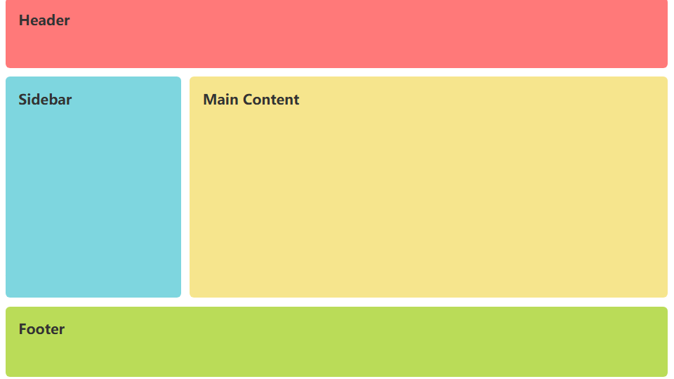 .container {            display: grid;                        grid-template-areas:                "header header"                "sidebar main"                "footer footer";                        grid-template-columns: 200px 1fr;                        grid-template-rows: 80px 1fr 80px;            height: 100vh;            gap: 10px;            padding: 10px;            box-sizing: border-box;        }                .header {            grid-area: header;            background-color: #ff7979;        }