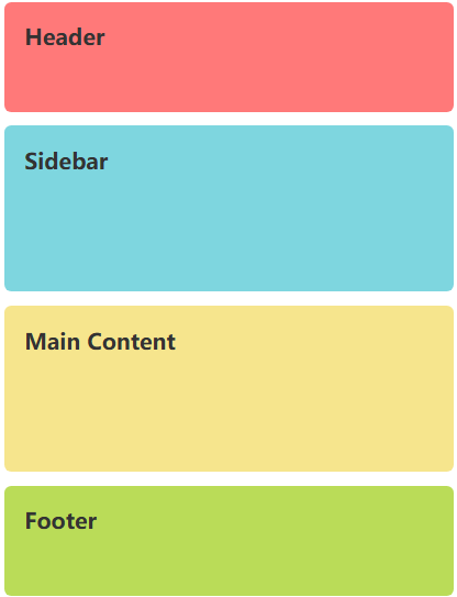 @media (max-width: 768px) {            .container {                                grid-template-areas:                    "header"                    "sidebar"                    "main"                    "footer";                                grid-template-columns: 1fr;                                grid-template-rows: 80px auto auto 80px;            }        }    </style>    <div class="container">        <header class="header">Header</header>        <aside class="sidebar">Sidebar</aside>        <main class="main">Main Content</main>        <footer class="footer">Footer</footer>    </div>